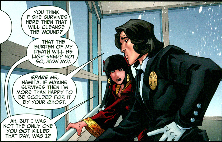 From the start, King found himself attracted to his fellow teammate, Cyclone. But he refrained from acting upon it because of guilt he still harbored guilt for the death of his girlfriend, Namita. Whether intentional or not, King's powers occasionally manifested Namita's image—a reminder of his past crimes. When Cyclone was critically injured in battle, (#8) Anna Fortune teleported she and King to a place he could recall without error—it was the site of Namita's death, Ankara, Turkey. (#9) This tragedy was the final call for King to let go of the guilt for the deaths he'd caused. After Cyclone underwent the pair emerged as a couple and King gave in to his feelings for her. (#13)