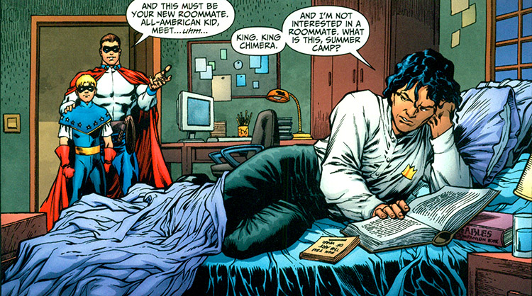 He had a British accent, and used the code name King Chimera. The aspiring hero joined the JSA at a time when their mission had expanded to include anyone carrying on the legacy of elder super-heroes. King Chimera's new roommate was the All-American Kid. On their first day at JSA headquarters, the team left to confront a team of super-villains, but the new members were ordered to remain behind. King had no desire to socialize with the Kid and chose to meditate instead. Meanwhile, the All-American Kid was seemingly possessed and stabbed the JSA's Mr. Terrific in the back! (JSofA vol. 3 #29)