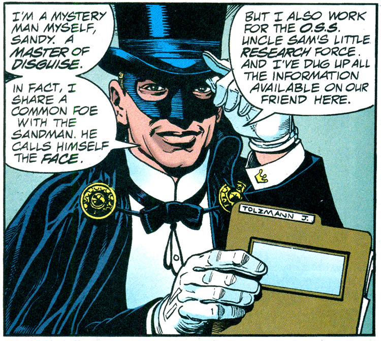 During the war, the King made peace with authorities, and was employed by the O.S.S. until the end of the war. His last recorded case was in 1945, when he aided the original Sandman and Star-Spangled Kid in defeating a disciple of the Stalker. This appearance suggests that the King might have participated in the All-Star Squadron, but no are no other references to confirm it. (Star-Spangled Comics vol. 2 #1, 1999)