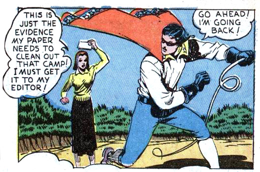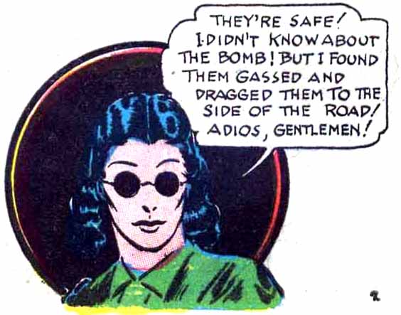 After Tex Thomson's (aka Mister America's) partner, Gargantua T. Potts, joined the French army as a cook, he was replaced on the crimefighting front by Miss X, a mystery woman whose disguise consisted solely of black glasses. (Action #26-27)