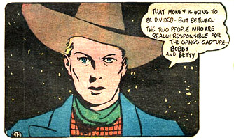 Tex Thompon shares the honor of having debuted in Action Comics #1 (June 1938)—the same as Superman. The strip was unremarkable in comparison to the Man of Steel and Zatara, or even another Western feature, "Chuck Dawson." "Tex Thompson" was a simple western type of adventure serial by Bernard Baily, who rather stretched his storytelling to fill the lengthy 12-page introduction. (Baily's best-known co-creation was the Spectre.) Like so many Golden Age characters, Tex was a millionnaire with too much time on his hands. This cowboy had struck it rich in oil and began travelling the world. In England, he came upon a dead man and was accused of his murder by a woman named Sonja and her cohorts. Things got complicated fast; the only witness to back up Tex was a boy named Bobby, whom the crooks had kidnapped. When the sheriff arrived, Tex punched him out in order to buy some time. Bobby freed himself and with the help of his friend Betty, alerted the authorities again. By the time they arrived, Tex had coralled the gang leader. When offered the reward for his capture, Tex gave the money to the kids instead. (Action #1)
