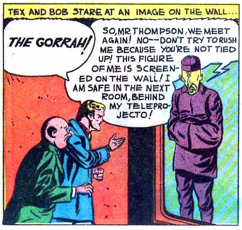 In the second issue—a tidier 6-page installment—the concept of "Bobby" became the character Bob Daley, a fellow adventurer who became Tex's righthand man. They sought and discovered a legendary "sealed city." It's ruler, the one-eyed Gorrah, invited them in. (#2) The Gorrah demonstrated that his people were invulnerable to bullets, and dropped Tex and Bob into a watery pit to die. They survived and rescued another native—the real Gorrah (leader) of the city—who then allied with them and overthrew the menace. (#3)