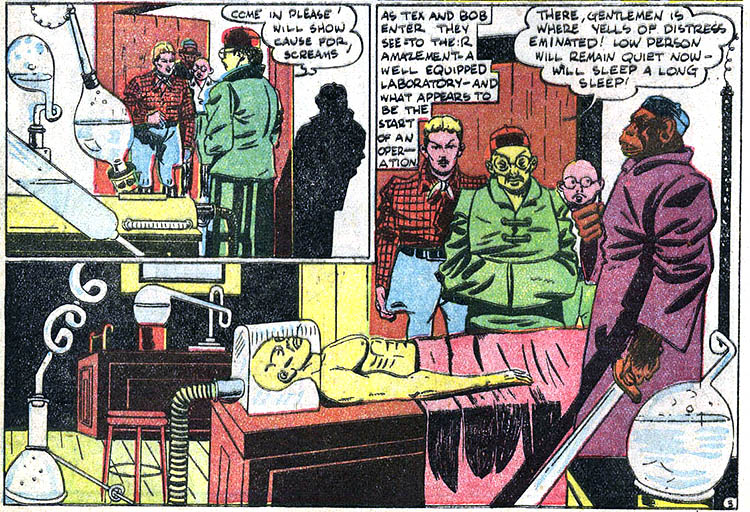In Asia, Tex Thompson and Bob Daley contend with the bizarre laboratory of Dr. Kichung. From Action Comics #8 (1939); art by Bernard Baily.