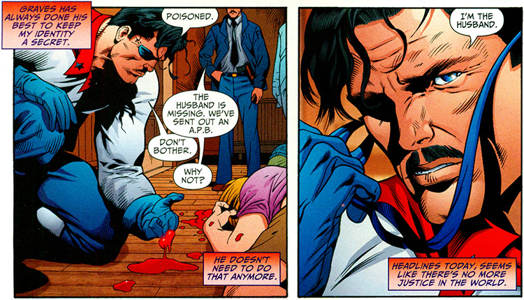 Soon a boy claiming to be descended from a World War II sidekick came to the JSA for mentoring. He called himself the All-American Boy, and said that his great-uncle served very briefly with the original Mister America, and was killed by a Nazi. (JSofA vol. 3 #29) This boy was actually the sadistic villain called Karnevil, who infiltrated the JSA on behalf of the Fourth Reich. Graves's FBI skills served him well when his new protege was accused of a bloody attack on Mister Terrific. (#32) Mr. America was repaid for defending the All-American Boy with a blow to the head when Karnevil finally dropped his disguise. (#33)