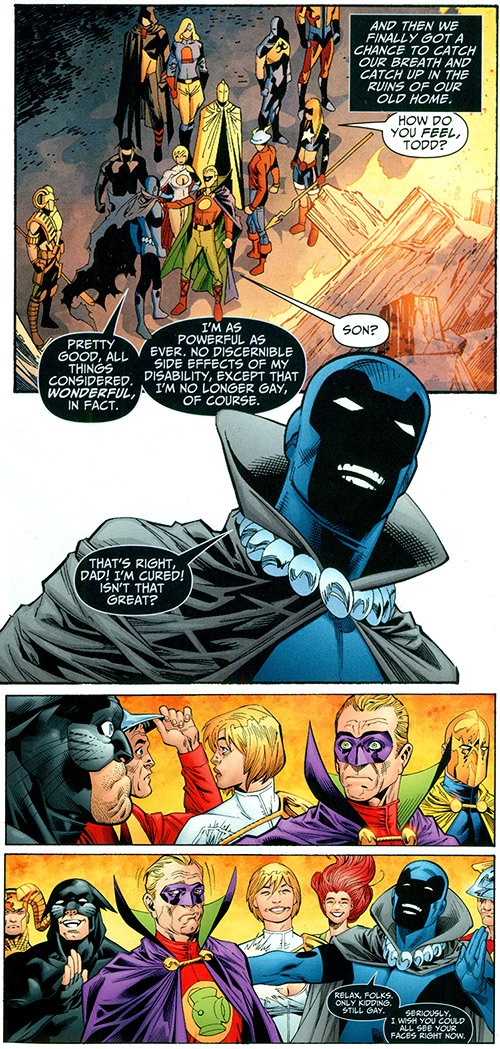 The Fourth Reich used the shadow power to take over the planet and prevent anyone from reaching Earth. What followed was a decade of darkness and oppression where most heroes were executed by Karnevil. After years, Mister Terrific found a way to send a message back in time, to himself. He told the JSA that they must hatch the Obsidian egg. When this was accomplished, the timeline corrected itself and Obsidian was key in defeating the Reich and Karnevil. Todd's outlook, attitude, and relationship with his father were better than ever, free from corruption. He decided to remain with the Justice Society and help round up the remains of the Reich. (#40)