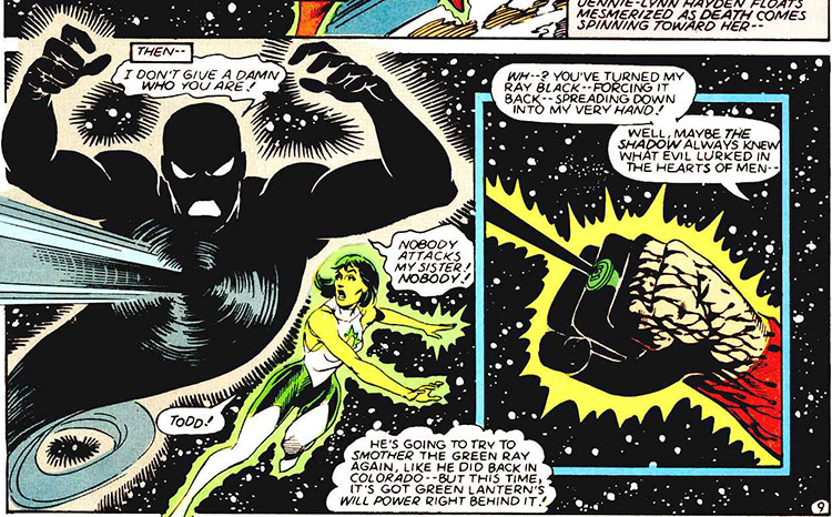 Alan Scott was paralyzed by Scythe, (Justice Society #44) and in seeking vengeance, Obsidian inadvertently freed Scythe from prison. (#48) Alan invented a special uniform to support his spine, (#49) but Green Lantern's suffering was brief; he died while destroying a god called D'arken. (#54)