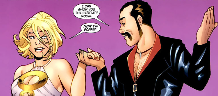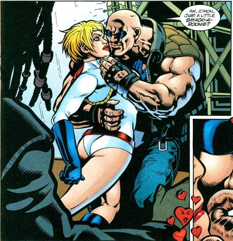 More interference from space arrived in the form of Vartox the Hyper-Man. His planet, Valeron, was sterile and he sought Power Girl to serve as genetic breeding material. (#7) After explaining that his peoples' mating was asexual, Karen agreed to help him. He used his Imprego-Ray on her, which induced a spiritual rebirth in his people. (#8)