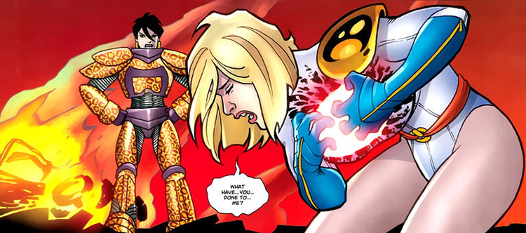 Karen decided to pick herself up and refocus on her civilian career as Karen Starr, head of Starrware Labs, which was looking to invest in ecological projects such as bio-ware, A.I., and nano-tech. She was attacked by the robots of a new Ultra-Humanite (Gerhard Shugel), who wanted to use her body as his new host. (Power Girl vol. 2 #1) The JSA stepped in to help (#2) and she also called in her friend, the new Terra. She triumphed and deposited Ultra in Blackgate Prison. (#3)