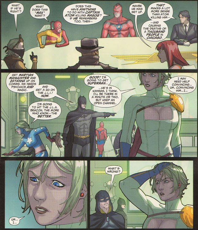 Even the Batman (Dick Grayson) succumbed to Lord's mind-erasing after helping Karen track Max to Antarctica. (#17) They tried to mobilize a strike with the JSA but the entire assembly lost their memories again as soon as they had been briefed. (#19) Meanwhile Starrware lawyers tried to keep her company solvent. (#20-21) When the original Batman (Bruce Wayne) returned, he proved that the Beetle had been murdered. (#21) Power Girl joined many other heroes in the final battle — in which they did not succeed. Max escaped prosecution by taking the matter onto the public stage and spinning lies about all his misdeeds. (Justice League: Generation Lost #22-24)
