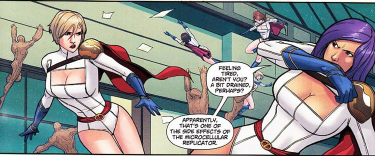 Power Girl appeared at a convention in her honor and seized the opportunity to speak to her young fans about "girl power." Her fans leapt to her aid when an alien named Rana transported the whole convention into space. Rana used a machine to copy Karen's powers, and some girls were accidentally empowered as well. They helped distract Rana so that Power Girl could land a final punch. Later the girls' powers were removed by S.T.A.R. Labs, but one girl secretly retained hers. (#26)