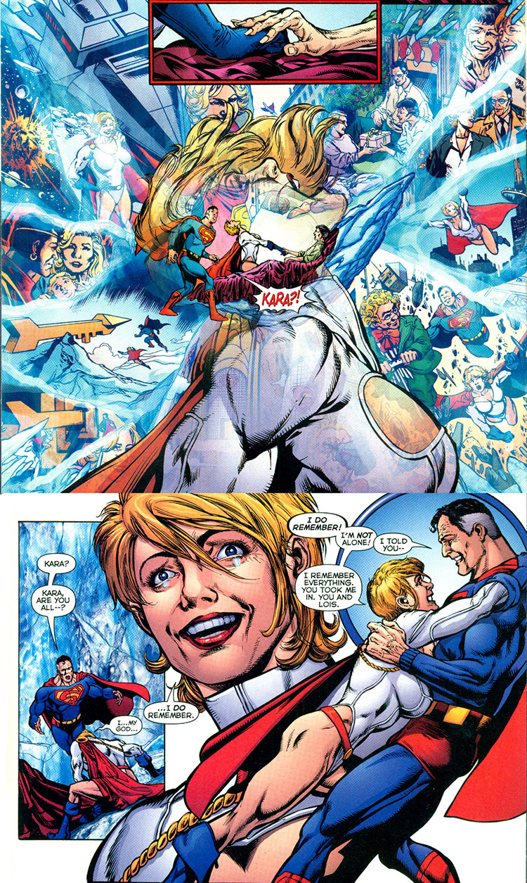 Karen eventually managed to escape from the Pirate, but fell into Alexander Luthor's trap. At long last, Kal-L had left his heavenly home. The cousins' reunion was disorienting for Karen, but she began to remember everything. Luthor claimed that she was not meant to survive the collapse of the multiverse, but somehow fell through a crack, like several others (such as Dark Angel, Harbinger, Pariah, and Lady Quark). The new universe had tried to reconcile her existence with false histories. Kal went on to tell her about the multiverse, and when Lois touched Karen's hand, her memories of Earth-Two came flooding back.