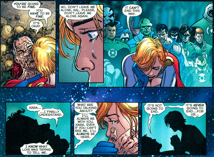 Her cousin Kal-L believed in Luthor's insidious plan restore Earth-Two, and convinced Karen that she'd been spared for a reason — to help them. (Infinite Crisis #1-2) But after Superman departed, Luthor and Superboy imprisoned Power Girl in a special tower designed to reconstruct the cosmos. (#4) During most of Earth's struggle against Alexander Luthor, Power Girl remained imprisoned there. In this crisis, both Lois (#5) and Kal-L perished. She was able to say goodbye to her cousin before his death (#7), but she was left alone again, save for her friends in the Justice Society.