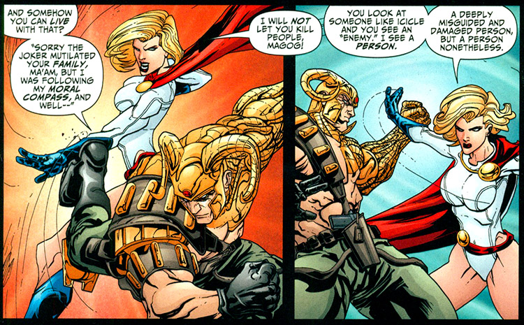 From the start, Power Girl clashed with Magog over the leadership style of the team. She had to stop him from from killing the Icicle, after which he stormed off. (#2-3) The All-Stars had to respond when Magog began running amok at Haven prison. Again Karen stopped him from killing and their differences become irreconcilable; Magog resigned from the JSA. (Justice Society of America Annual #2)