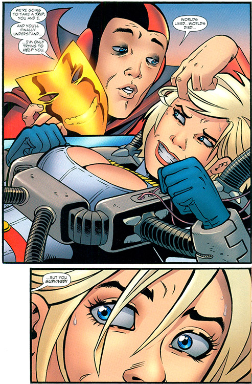 Karen unwittingly became a pawn Alexander Luthor, who was now hell-bent on creating a "perfect" universe. He sent another Crisis anomaly — the Psycho Pirate — to capture her. (JSA Classified #1) The Pirate's power made her hallucinate a myriad of different pasts, but she also began to subconsciously remember her life on Earth-Two. This led her to seek out the current-day Huntress, who on Earth-Two had been her best friend. (#2-3) Note: One of her hallucinations was that she was Andromeda from the 30th century Legion, and in another she was the Supergirl of the anti-matter universe.