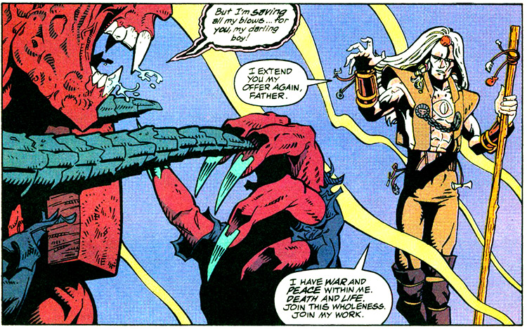 By the time Scarabus escaped from Hell (#106), Power Girl's child had studied with monks in Thailand and aged to adulthood. He emerged with great powers and took the name Equinox. Equinox proclaimed that he was destined to end the war between the Lords of Order and Lords of Chaos. He destroyed his "father" Scarabus then disappeared and was never seen again. (#108)