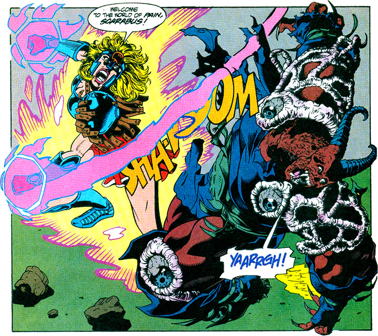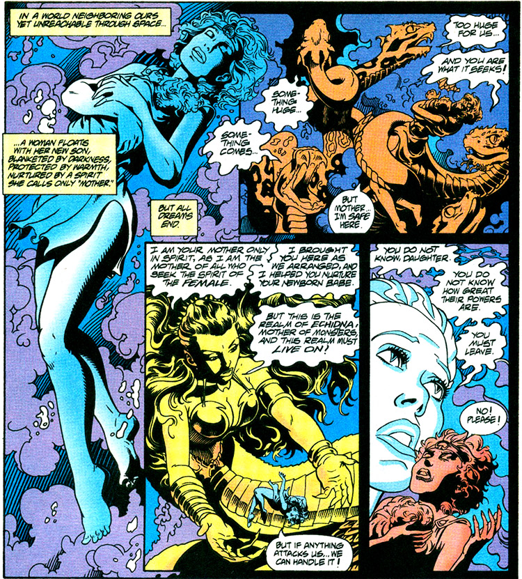 She ultimately reconnected with Arion, who was still alive and living in New York City. (Arion #6, Justice League Quarterly #13) When they met, Power Girl's supposed grandfather had implanted her with some essence from the demon Scarabus. It developed into a fetus and she became pregnant. This child was born during the "Zero Hour," (Zero Hour #0) and she fled with it to the safety of Echidna's lair.