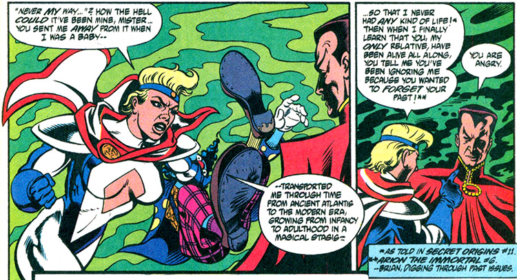 The child (she was strangely compelled not to name him) had inherent magical abilities that protected them both from harm, and the baby boy grew abnormally fast. Scarabus arrived to destroy this child, and Arion returned and confessed to his manipulations. He claimed he had acted according to prophesy, knowing only that his great-grandson would be a key player in future events. The League helped battle Scarabus but it was Power Girl who sent him packing — her son magically empowered with mystic might. (Justice League America #93-94) Soon the boy had aged several years and he left his mother to undertake an unknown mission. (#97)