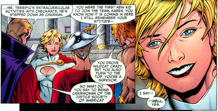 A year after the Crisis, the JSA's founders were urged by the JLA to reassemble. They were encouraged to train the growing number of "legacy heroes," those who took on the mantle of older or retired heroes. They chose Power Girl as part of their core membership. She and Mister Terrific recruited Maxine Hunkel aka Cyclone, the granddaughter of the original Red Tornado. (Justice Society of America vol. 3 #1) After defeating the Fourth Reich, Power Girl enthusiastically accepted the elders' offer to make her the group's first chairperson. (#4)