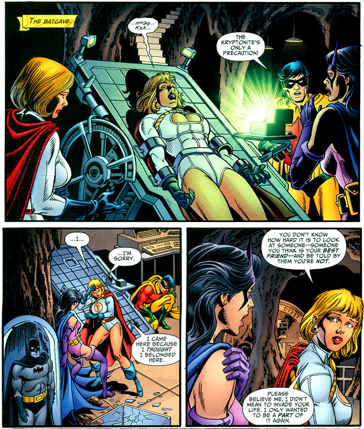 After her time in the Justice League, Power Girl partnered with Oracle (formerly Batgirl), to form the first so-called "Birds of Prey." On her final mission with Oracle, many people lost their lives. This caused great feelings of guilt and regret, and Kara cut ties with Oracle, working with her only very reluctantly. (Birds of Prey #42)