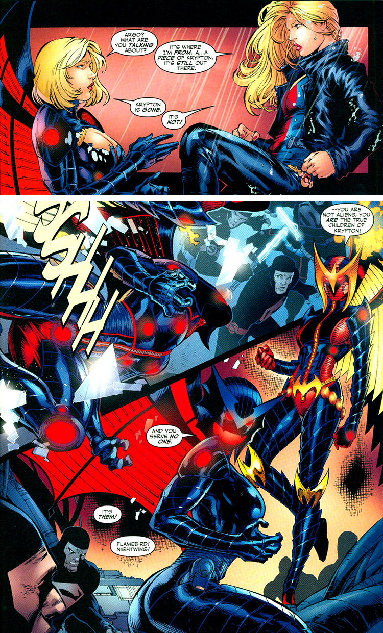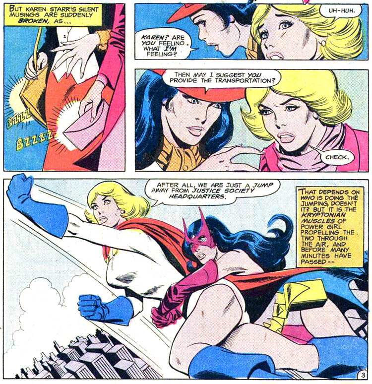 After this, the JSA ceased operating for a year and Karen became a friend and mentor to her younger counterpart, Supergirl. Karen accompanied Supergirl on a mission to rediscover her former Kryptonian home. This mission took them to the bottled city of Kandor, where they had to adopt the identities of Nightwing (Power Girl) and Flamebird (Supergirl). (Supergirl #6-9)