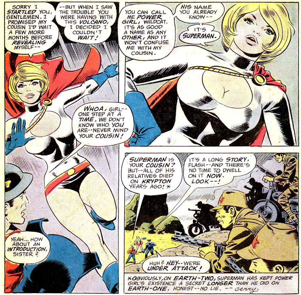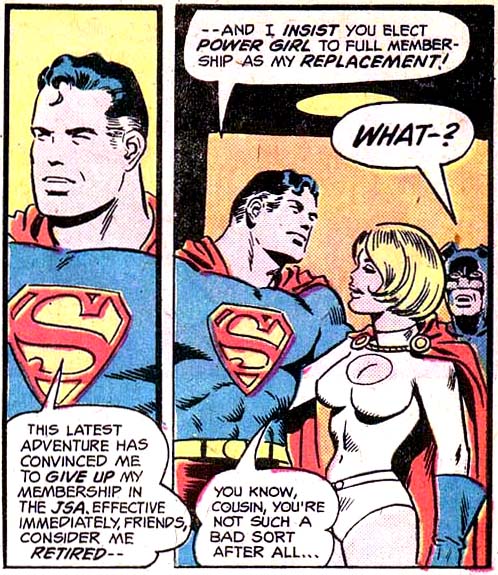 On Earth, she somehow reconnected with her lost cousin, who was now known as Superman. He and his wife, Lois Lane, took in Kara but kept her existence a secret for a time. She burst onto the scene publicly during a battle between the Justice Society and the villain Brain Wave. She was brash and direct when she met their members, the Flash and Wildcat; she proposed a new era for the JSA — one defined by "new blood" that would include herself, Robin, and the Star-Spangled Kid. (All-Star Comics #58) After the team defeated Brain Wave, she was welcomed into the Justice Society. (#59) As Power Girl was throwing herself into her new role, Superman decided to retreat. He formally retired and nominated his cousin as his full-time replacement. (#63)