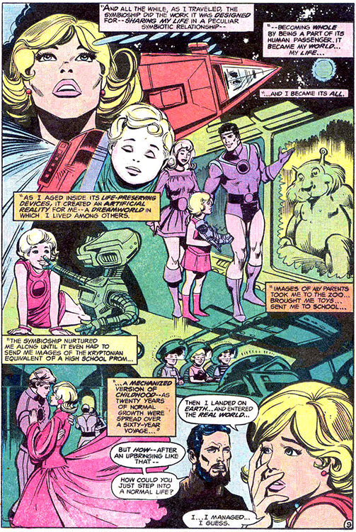 During her journey, her "symbioship" kept her in suspended animation and she aged only about the equivalent of 20 years. The ship also subconsciously educated her, and manufactured a fictional reality of her of life — a normal adolescence on Krypton. (Showcase #97-98)