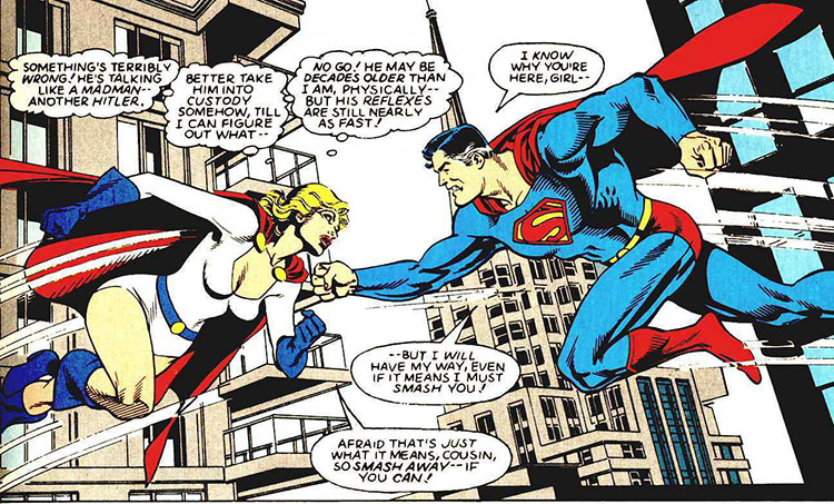 The reintroduction of a Kryptonian Supergirl in the universe caused an anomaly. When the two Karas met and shook hands, Power Girl went mad, her powers out of control. Mister Terrific hypothesized that their origins were so similar that they were like the same person, and had "overloaded" one another. The two quickly made amends. (Supergirl #1) Note: After Supergirl's return, Power Girl was more often referred to as "Karen" than "Kara."
