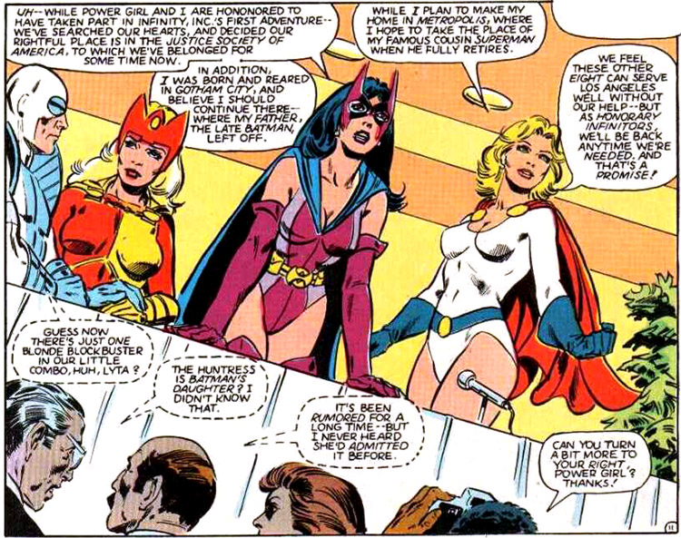 The Star-Spangled Kid quit the Justice Society to lead Infinity, Inc. At their official press conference in Los Angeles, Power Girl and the Huntress voiced their support for the new group but rejoined the JSA. (Infinity, Inc. #12) NOTE: Infinity, Inc. #8 (Oct. 1984) includes a "personnel file" on Power Girl.