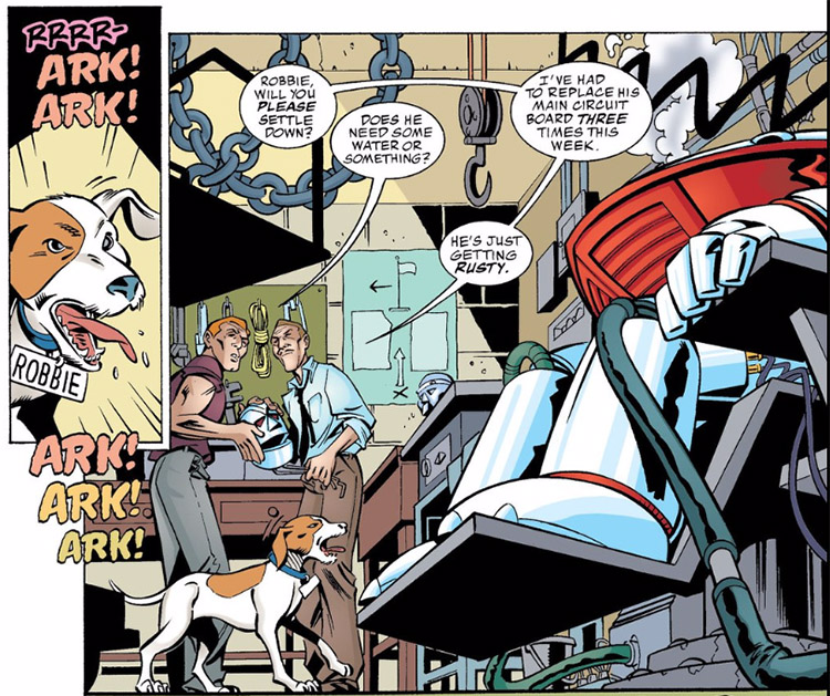 Dr. Crane helps Pat Dugan with his exo-suit. From Stars and S.T.R.I.P.E. #8 (2000); art by Lee Moder and Dan Davis.