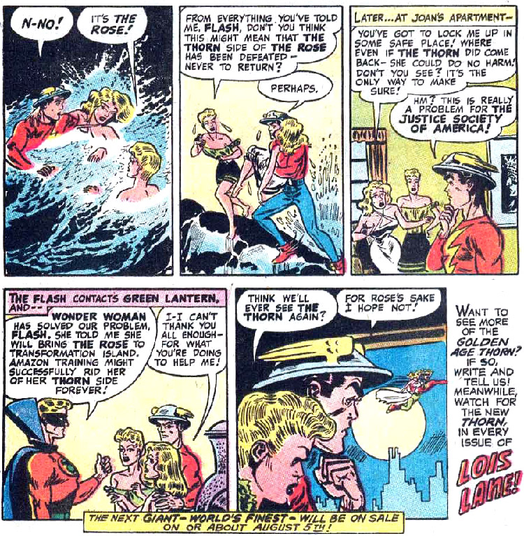 Perplexed, the Flash contacted his Justice Society of America comrades for help. Wonder Woman suggested taking Rose to the Amazons' Transformation Island in hopes that Amazon training would allow her to overcome her evil personality. Green Lantern agreed to fly her there, although as a man, he could not actually land on Transformation Island or Paradise Island. (Unpublished 1948 story excerpted in Lois Lane #113, Infinity Inc. Annual #1)