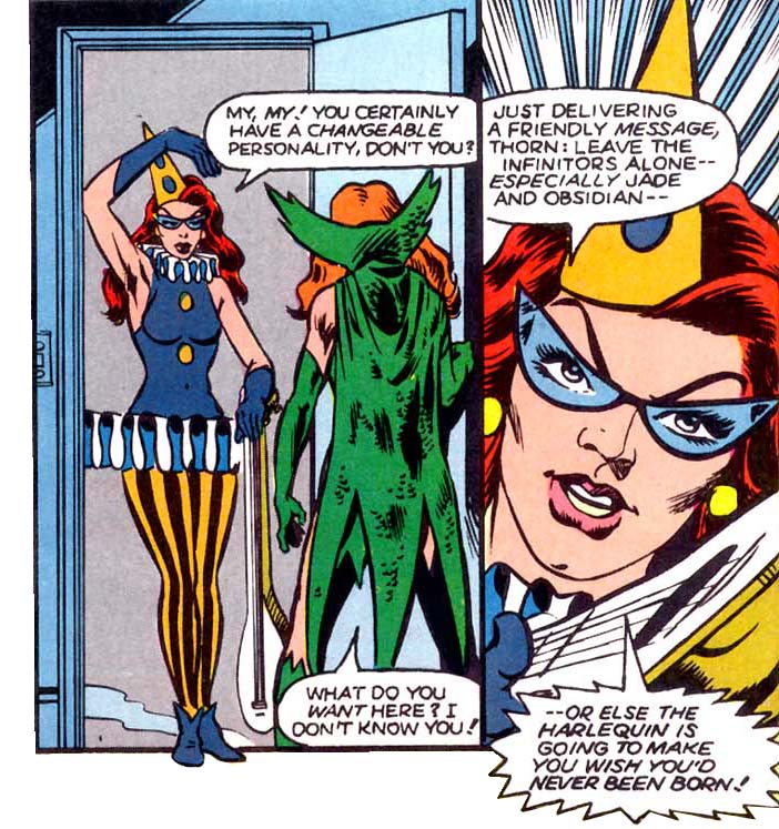 In L.A., the Infinitors invited Rose to stay in one of the bungalows on the Stellar Studios lot, now owned by Sylvester Pemberton, the Star-Spangled Kid. (#14) While she was staying there, her Thorn self began to reassert itself once again. Molly Maynne, who had recently resumed her old identity as the Harlequin, confronted the Thorn and warned her to stay away from Green Lantern, Jade, and Obsidian (Florin's son Todd). (#18) Molly later persuaded Rose to reveal most of her history as the Thorn.