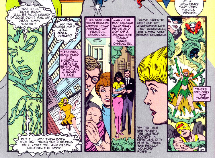 Using the name Smith, Rose took refuge in a town in Wisconsin, where she soon learned she was pregnant. Nine months later, she gave birth to twins. She did not yet realize that both children were metahumans, due to Rose's superhuman abilities and her exposure to the magical energies of Alan's ring during their conception. However, her Thorn personality again resurfaced and threatened to kill the children, so she fled once again, abandoning the twins. They were subsequently adopted by other families as Jennie-Lynn Hayden and Todd Rice. (Infinity Inc. Annual #1) Those children eventually developed innate super-powers and became the heroes called Jade and Obsidian.