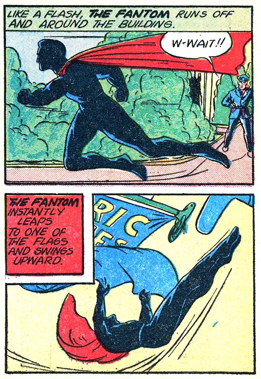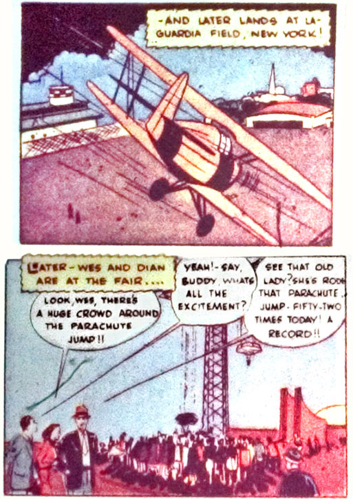 The Sandman paid several visits to the 1939-1940 World's Fair in New York City. In the first (his first appearance in print), Wes Dodds was nervous about displaying his company's new ray gun at the fair. His colleague, Evarts, insisted and as it turned out, had his own plans for it. The Sandman used his other tool, the gas gun, to distribute a sleeping gas that left the culprits asleep for the authorities. In this and several other early adventures, the Sandman doffed his clothes and took to the water, yet another one of his magnificent skills. (New York World's Fair Comics 1939) On his second visit he pursued Blackie Saunders, who kidnapped Dian's wealthy aunt Agatha. (New York World's Fair Comics 1940)