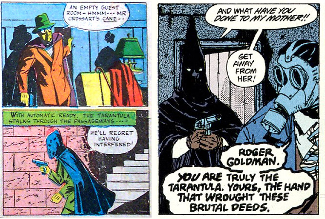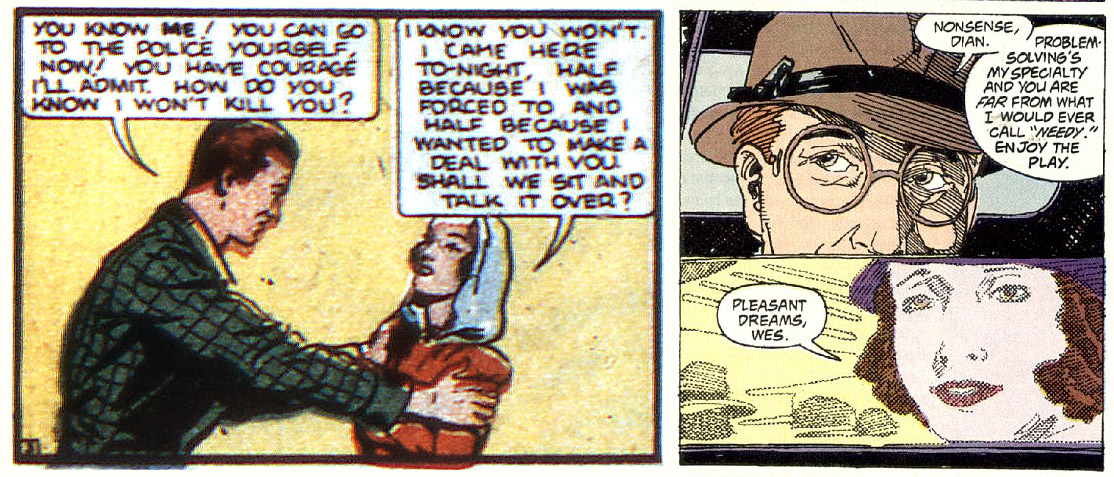 The first chapter in Sandman Mystery Theatre was titled "The Tarantula," but it bears little resemblance to Adventure #40. Matt Wagner and artist Guy Davis conceived a villain, Roger Goldman, who commited serial murder under the influence of his domineering mother, Miriam. On the matter of the Sandman's girlfriend, Dian Belmont, S.M.T. diverges from Adventure. Her first appearance in print was Adventure #47, but in Mystery Theatre, Dian is his leading lady from the beginning. Wes has returned to New York within the past year. He and Dian met at a society event and their attraction grew quickly. Her friend, Catherine Van der Meer, was one of the Tarantula's victims, which sparked Dian's own investigative inclinations; she used her father—District Attorney Lawrence Belmont—to learn about open cases. Wes, in turn, used both of them to inform the Sandman's next moves. (Sandman Mystery Theatre #1-4)