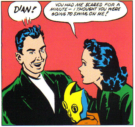 In Sandman Mystery Theatre, Dian Belmont's role was as important as the lead character's. Dian became Wesley's soulmate and after their first sexual encounter, (#16) they became quickly and deeply committed to one another, and remained together their entire lives. It wasn't long before she discovered his dual identity, either. (#21-24) At one point, Dian became pregnant with Wes' child and consulted Dr. Charles McNider (the future Dr. Mid-Nite). (#55) She ultimately chose to have an abortion because their relationship at the time was uncertain. (#56) They never had children, and never married, despite Wes' proposal. Wesley gave Dian his mother's ring on New Year's Eve, 1939, after which they set out for Europe to rescue Wes's brother Gerald. This was the last issue of Sandman Mystery Theatre.) (S.M.T. #70)