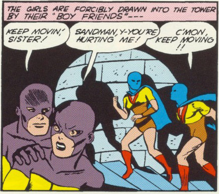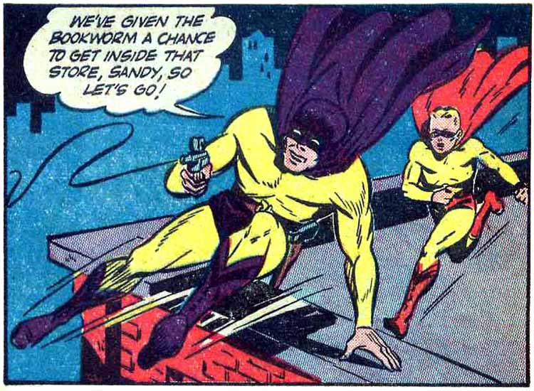 It all began with Wes driving along the countryside in his suit and hat. When he hit trouble, he stripped to his "glamorous" new costume and declared that his day clothes "only hamper my movements." That was all the explanation ever given for this change, and the Sandman quickly set about pursuing a horde of giant mutant bees. From nowhere, Sandy the Golden Boy appeared and he was conveniently clad in a similar costume. Sandy had been playing at being Sandman, studying and training in the hopes of fighting with his hero. The Sandman was impressed by the boy and they traced the source of the bees to a nearby farm. Bess Buttsford and her father had treated their hives with a special thyroid extract that enlarged the bees—and their Queen Bee developed human-like sentience. By working together, the new duo killed the pests and the Sandman made Sandy his official partner in crime fighting.
