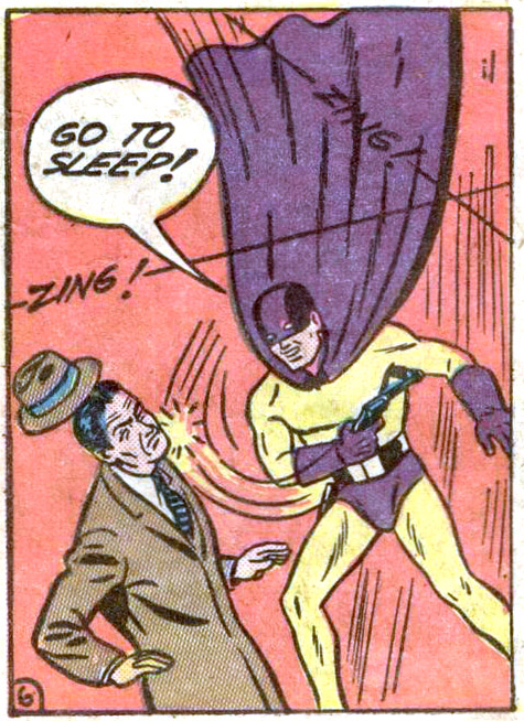 The Sandman's second appearance launched his feature in Adventure Comics #40 (July 1939). The Sandman was already a bane to the police. When actress Vivian Dale was kidnapped by the Tarantula, Wesley was at a private club with his friend, Tom. Tom hoped the Sandman would take the case, and compared the vigilante to the fictional detective Philo Vance. Later that night, Dodds bid his manservant, Humphries (the same name used in S.M.T.), good night, put a small Sandman doll on his bed pillow, and retreated through a secret wall panel to an underground laboratory. There he prepared the chemicals to use in his gas gun, and donned “all black apparel” (but colored brightly by the colorist). The Sandman found the black-hooded Tarantula creeping about Vivian's home, and unmasked him as a friend of hers, Mr. Crossart. The Tarantula described the scent of the Sandman's gas as “sweet” and “violet.” (Adventure #40)