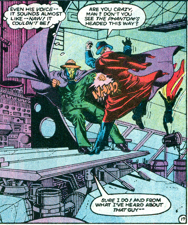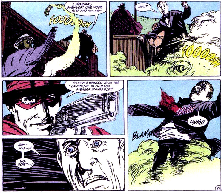 The 1987 origin story from Secret Origins set the Sandman's debut at the Fair. It paid homage in two ways, both to the Sandman's first appearance, and to another Golden Age hero called the Fantom of the Fair (later Fantoman) who first appeared around the same time, in Centaur's Amazing Mystery Funnies vol. 2 #7 (July 1939). The Sandman's adversary was called the Phantom of the Fair and he looked the same as the Centaur hero. Wes had discovered that his childhood friend, Lee Travis, had also taken to crimefighting as the Crimson Avenger. As the heroes fought one another, the super-powered Phantom escaped. (Secret Origins #7) In Sandman Mystery Theatre, "The Phantom of the Fair" played with some of the Origins details but the Sandman's encounters with the Phantom and the Crimson Avenger were not part of his origin. The S.M.T. Phantom was Gerald Zimmerman, a sadistic serial killer who targeted gay men and killed Wes' friend, Robert Li. In dreams, Wes saw the killer and connected him to "the Corinthian" (a living nightmare from Gaiman's Sandman). Police detective Jim Corrigan (who would become the Spectre) also worked this case. Afterwards, NYPD Lt. Anthony Burke denied the existence of the Sandman and the Crimson Avenger, suggesting that a reporter "pack up and head for Central City... go find 'the Flash!'" NOTES: This was an editorial error; the original Flash was active in Keystone City, not Central. The Corinthian first appeared in Sandman #10 (1989). (Sandman Mystery Theatre #41-44)