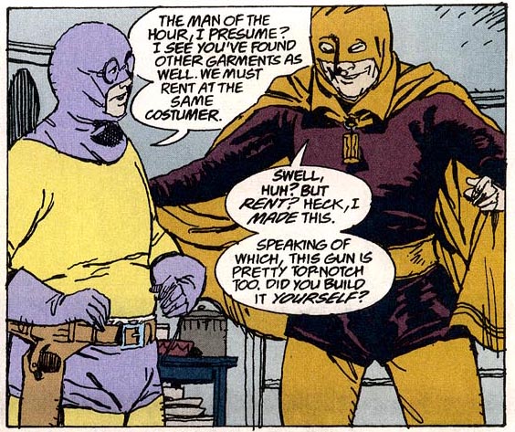 In post-Crisis continuity, the Sandman might be considered the DCU's first costumed adventurer. Golden Age Secret Files #1 (2001), reported that the Crimson Avenger was the first costumed hero in current DCU continuity. However, Secret Origins #5 ties the Crimson Avenger's debut to the famous broadcast of Orson Welles' War of the Worlds on Halloween of 1938 (months after Wes became the Sandman). One could argue that while the Avenger may have been the first prominently known masked avenger (thanks, perhaps, to Travis' publicity in his own newspaper), he was actually preceded by several other heroes including Dr. Occult, Quicksilver, the Sandman, and (probably) the Flash. See the JSA Chronology of the Golden Age.