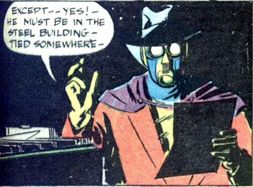 Most of the Sandman's cases sprang from breakthroughs in science and chemistry. The dangers included uranium death rays (#57, 62), killer orchids (#58), “mystical” rubies (#59), and disintegrating rays. (#61) One inventor called himself the Unseen Man and used his invisibility pigment to commit crimes. The Sandman's cobalt blue glasses were able to make him out, catching reflections of the paint. (#64) Scientist Prof. Josephus Doombie invented a serum to shrink himself, and also administered it to the Sandman and Dian. (#67)