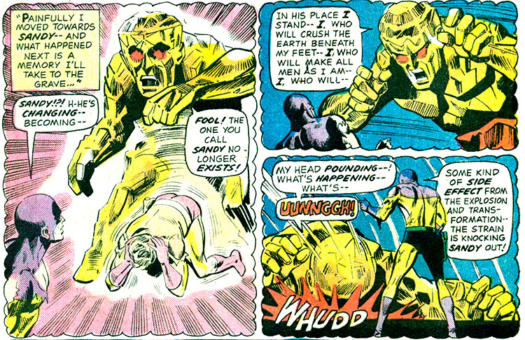 While the Sandman was participating in a JSA/JLA team-up, Sandy's confinement cell was interrupted by a tremor. When he was freed, he followed the source of the disturbances and absorbed the shocks. Sandy could travel through the earth and turn his form into sand. He couldn't yet speak, and the heroes interpreted his actions as malevolent. He was soon able to explain himself, and the Sandman was horrified to learn that Sandy had actually recovered from his transformation soon after it happened. But the amount of gas that Wes let into the chamber kept Sandy from acting on his own will. The pair went their separate ways and it was some time before Sandy reemerged. (Justice League of America #113)