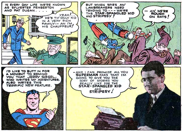 Perhaps hoping to cash in on the success of Timely's Captain America, National tapped Superman's creator, Jerry Siegel, to create their own pair of red-white-and-blue heroes. The dynamic of the Star-Spangled Kid and Stripesy was reversed — a teen hero with an older sidekick. Their feature outlasted many other costumed heroes, into 1948. The Star-Spangled Kid joined the Justice Society during the 1970s revival of All-Star Comics and has become a part of an unexpectedly complex family of DC characters.