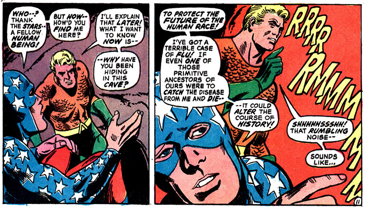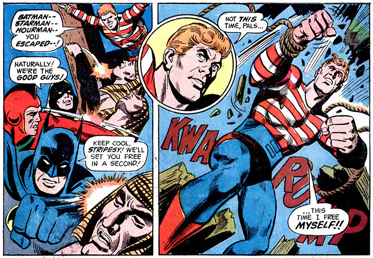In late 1948, it was said, they were betrayed by their comrade, the Spider. Following a battle with the cosmic Nebula Man, Star-Spangled Kid, Stripesy, and the others were scattered across various points in time. Sylvester was stranded 50,000 years in the past, while Stripesy found himself in ancient Egypt, where he was made a slave. When the Justice League and Justice Society learned about this injustice, the assembled teams to rescue all of the Soldiers. (Justice League of America #100-102, Stars & S.T.R.I.P.E. #9) Note: Stars & S.T.R.I.P.E. #0 (July 1999) placed Sylvester's time in the past at 14,000 BCE.