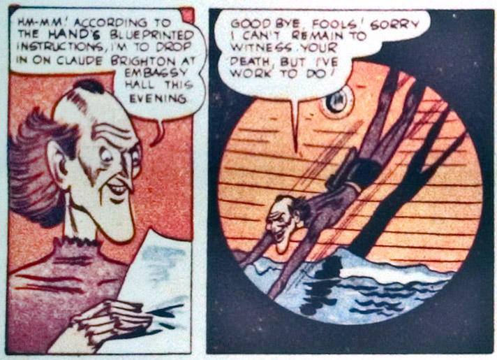 In their first regular adventure, they trailed the Nazi Fifth Columnists, Klaug. The heroes seemed to exhibit super-strength as they easily flung the bad guys over their heads. They used Sylvester's status as a spoiled rich kid to get him "kidnapped" by the Nazi Bund and took them down from the inside. They left their quarry for the police, unconscious and adorned with yellow star-shaped notes on their foreheads.