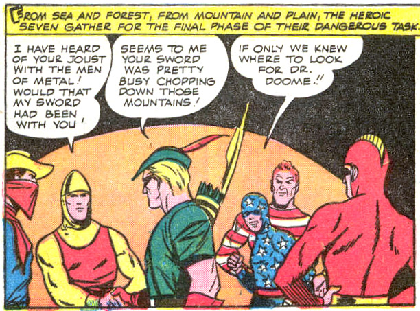 The Needle was the Kid's most recurrent enemy. The tall, rail-thin villain used a gun that shot needles. (#4-5) The Needle was recruited by the Hand to help incapacitate seven heroes. Star and Stripesy responded to the Hand's challenge at the same time as five other heroes. After all of them defeated their respective opponents, they finished the Hand as a group. They concluded the case by formally founding their own group, the Seven Soldiers of Victory. (Leading Comics #1, Stars & S.T.R.I.P.E. #9) Note: The Soldiers were DC's second super-group (after the Justice Society of America) and their stories borrowed the formula from All-Star Comics — an adventure framed by a team meeting, but broken down into individual tales.