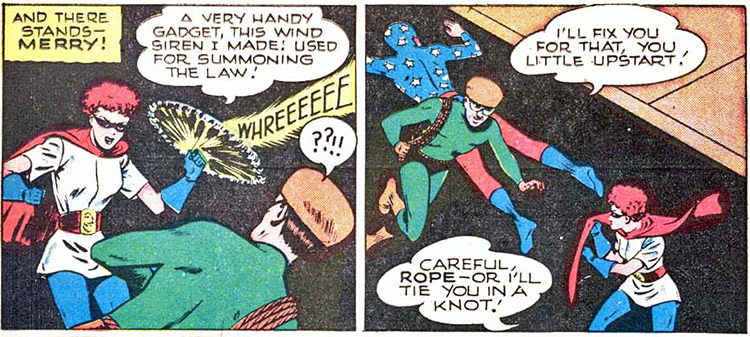 When the Star Spangled Kid garnered the ire of the Great Presto, Merry was eager to help round him up. Sylvester refused her, so she adopted her own costume and trailed after them. Although she was captured, she managed to tamper with the villain's trick guns so that when the Kid caught up to him, they were ineffective. (#82)
