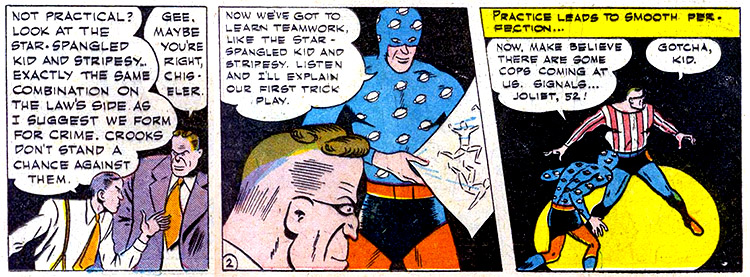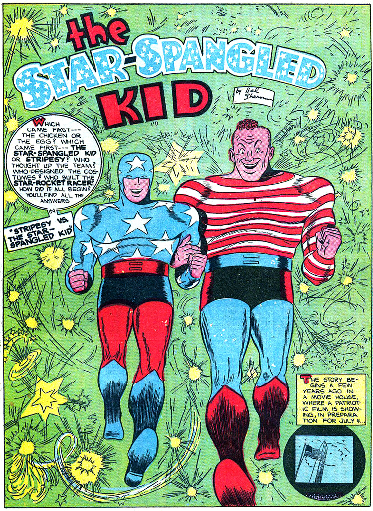 As the Star-Spangled Kid, Sylvester took his average car, and Pat — as Stripesy — busted out his greatest creation, the Star-Rocket Racer, a "turnabout car" that with a touch of a button whirled itself into a flying speedster. The new heroes headed for Flower Field Airport where Star managed to take out several Nazis before Stripesy arrived. Pat followed the remainder of the group and mopped them up. When the two finally met, they were indignant toward one another, miffed that each had stolen his thunder. But when they were bound together by the Nazi leader, they were forced to team up.