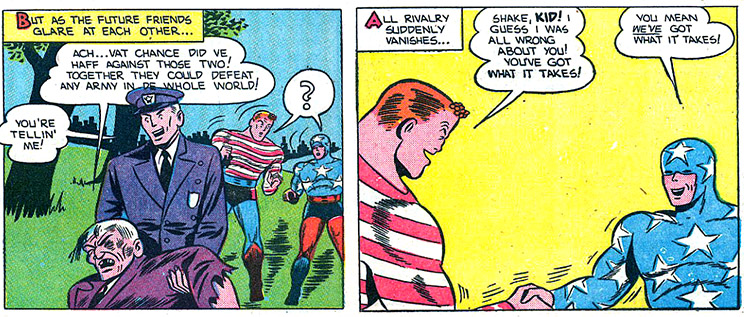 The feature survived for eight years — a surprisingly long time — perhaps because this was the age of the boy heroes like Captain Marvel. Also, Star Spangled Comics was eventually spearheaded by Robin the Boy Wonder, a kindred teen hero (in issue #65, Feb. 1947).