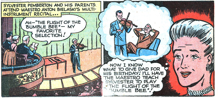 Sylvester always played up his "weaknesses" as a bookworm and helpless recluse. Mr. Pemberton, correspondingly, constantly tried to get his son to be more outgoing, athletic, and social, instead of spending time with his studies. His father sent Sylvester to summer camp and Pat served as a counselor, (#23) and to a ranch to 'man him up.' There Syl and Pat concocted a plan to have Sylvester kidnapped so that he could demonstrate his manliness by escaping. Instead his father became afraid of further kidnapping attempts, and brought Sylvester home. (#36)