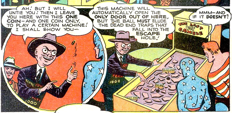 Even those opponents who boasted colorful names did not appear all that colorful; they included: Ousted foreign leader, Ian Chervonitz, who created the Cult of the Cat's Paw to restore himself to power. (#47) The Zebra, czar of crime teamed with a barber to target his rich customers. (#53) Professor Destine was a failed astronomer who swindled rich ladies as an astrologer. (#63) False-Face said they'd met several times before, but he was utterly forgettable. (#68) The saber-wielding Ghost of Sir Phineas used projections to fake a spirit form. (#75) At least Pin-Ball had an odd-shaped spherical head, and bothered to wear a suit decorated with pinball slogans. He crafted special pinball games that the heroes had to win to escape. (#78)